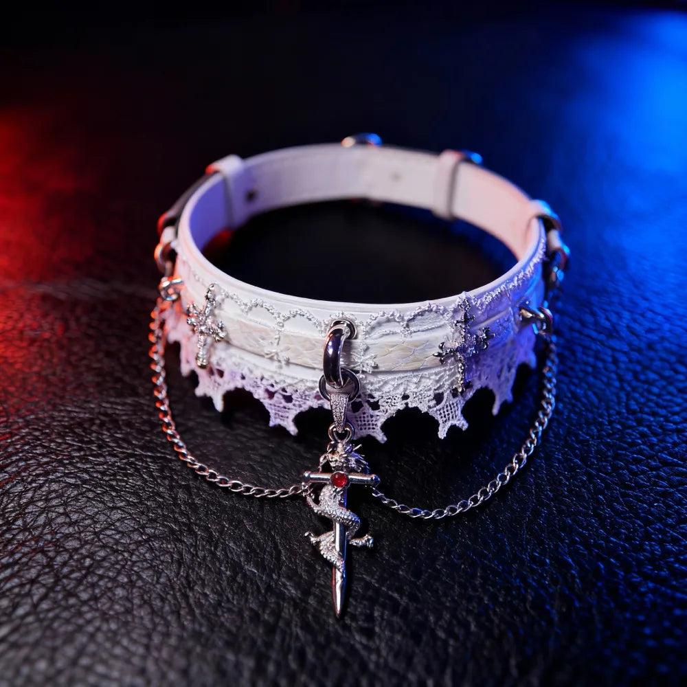 Unveil your dark elegance with this Gothic Lace Choker Necklace — a mesmerizing fusion of Victorian romance and punk edge. Handcrafted from delicate white lace, it’s embellished with silver cross charms, dangling chains, and a striking dragon sword pendant accented with a deep red gemstone.