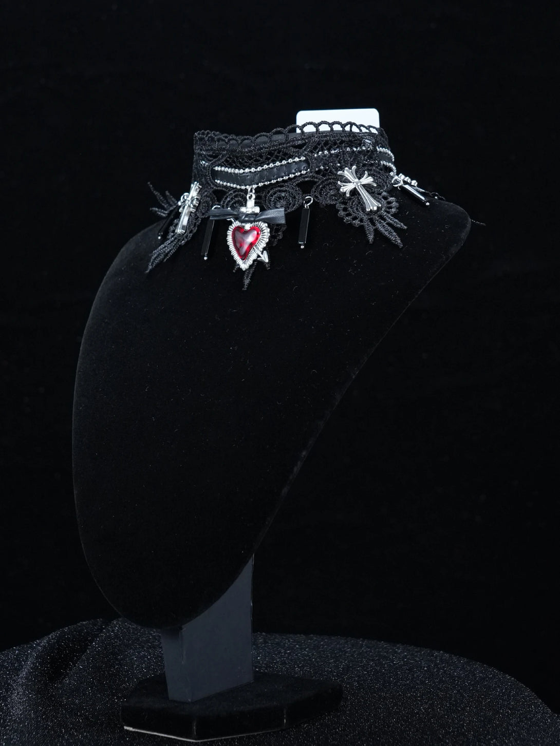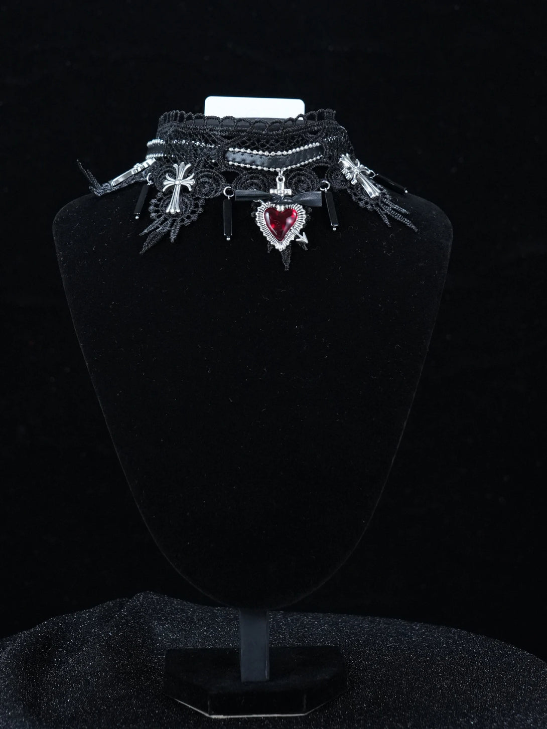 This intricate black lace necklace is layered with delicate details — from shimmering metal crosses to a bold red heart-shaped pendant that steals the spotlight. Designed to sit close to the neck, it channels that perfect blend of vintage vampire energy and soft grunge rebellion. The silver-tone accents contrast beautifully against the deep black lace, giving it a mysterious and romantic edge.