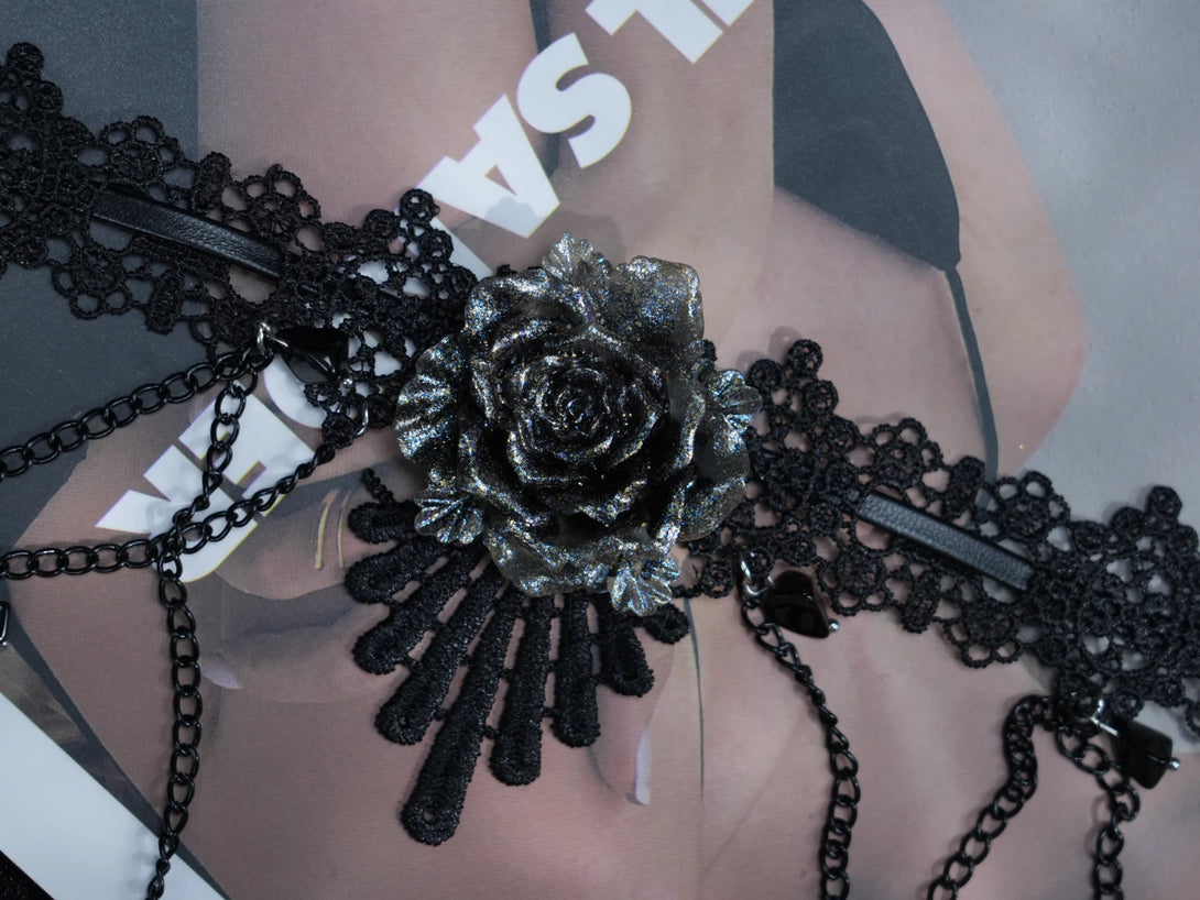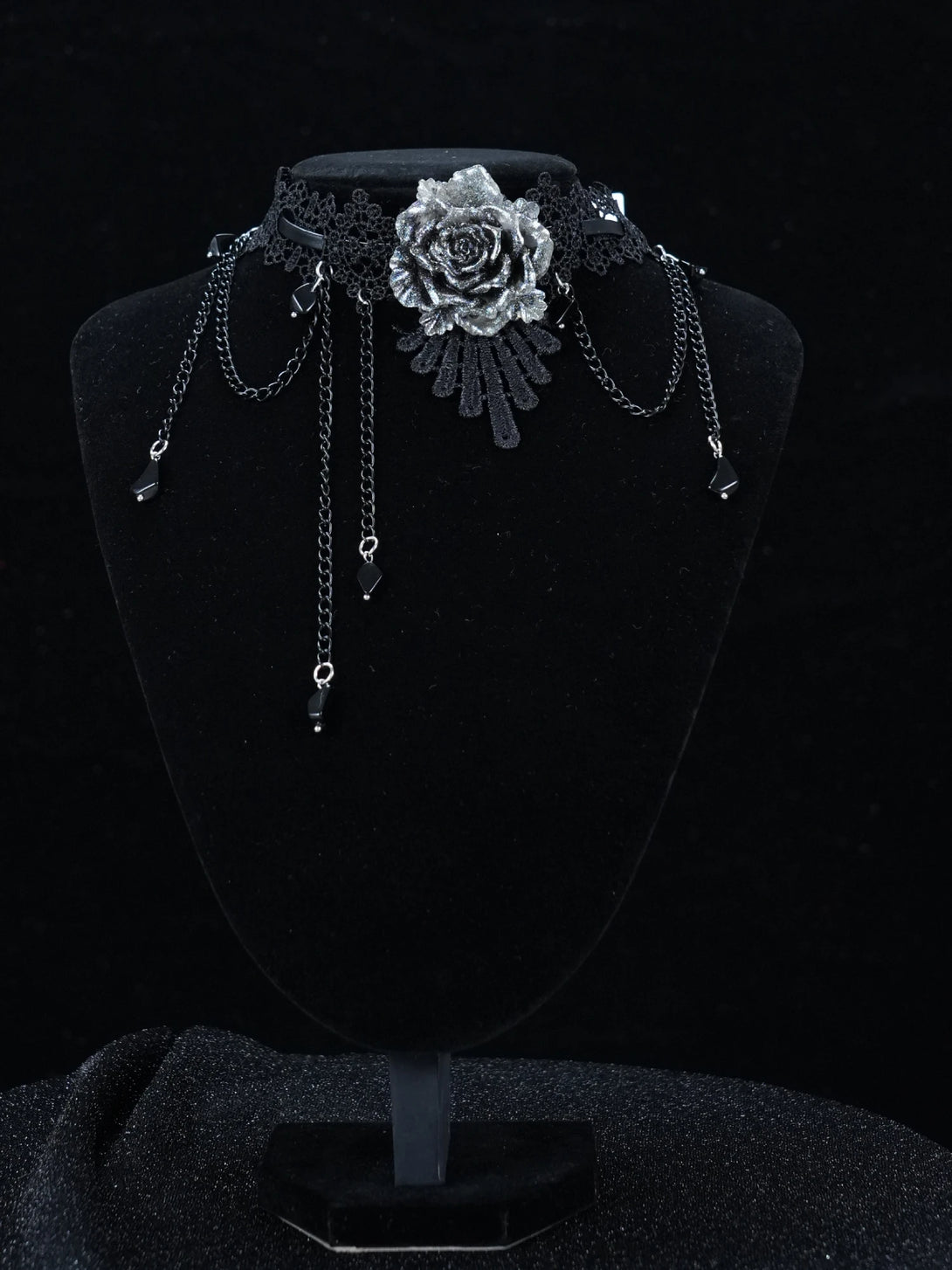 This gothic statement necklace features an intricate black lace band adorned with a striking silver-white rose at its center. Delicate black and silver-toned chains drape from the floral centerpiece, adding moody movement and ethereal texture. Designed to hug the neckline, this piece evokes the dark elegance of vampire romance, with a touch of rebellious Y2K flair.