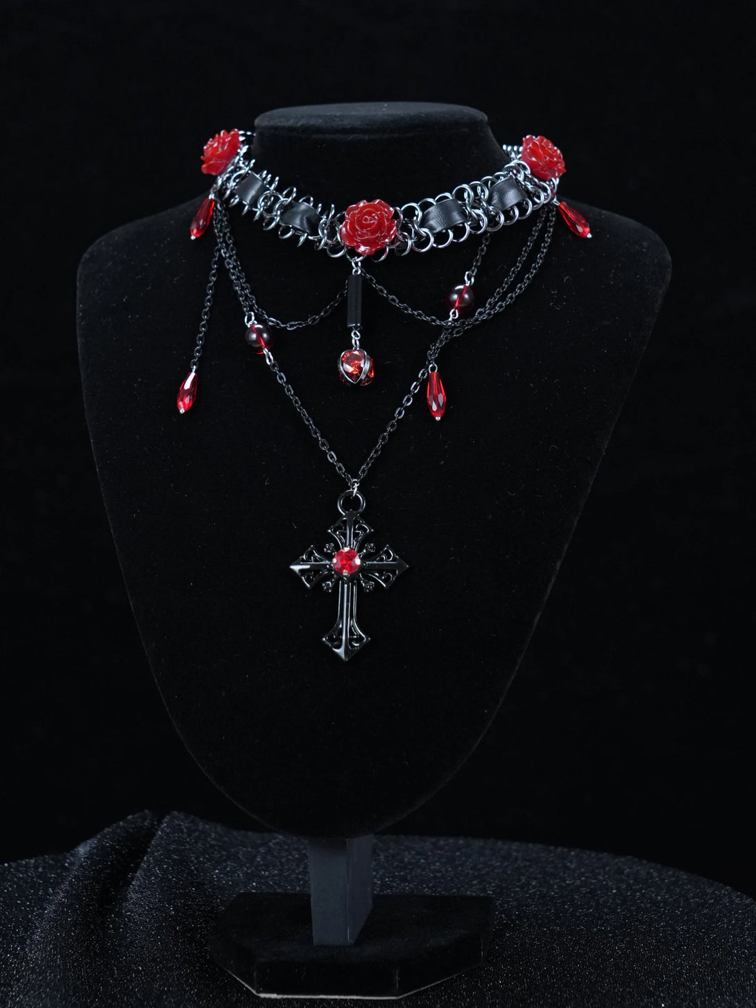 This layered statement necklace features an intricate cascade of silver-toned chains, adorned with vivid red rose accents and ruby-inspired gemstone charms. A dramatic cross pendant anchors the look, adding a sacred edge to its romantic darkness. The deep red tones contrast beautifully with the cool metal, creating a hauntingly elegant aesthetic that’s equal parts rebellious and romantic.