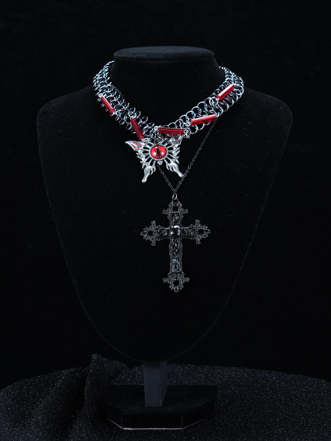 This Y2K gothic layered necklace blends mysticism with edgy street style. Featuring dual fine silver chains, the top layer is adorned with elongated red beads for a bloodline effect. The lower layer carries a striking evil eye charm with deep crimson tones—your ward against negativity—followed by a bold, intricately detailed cross pendant that grounds the design with dark ritual energy.