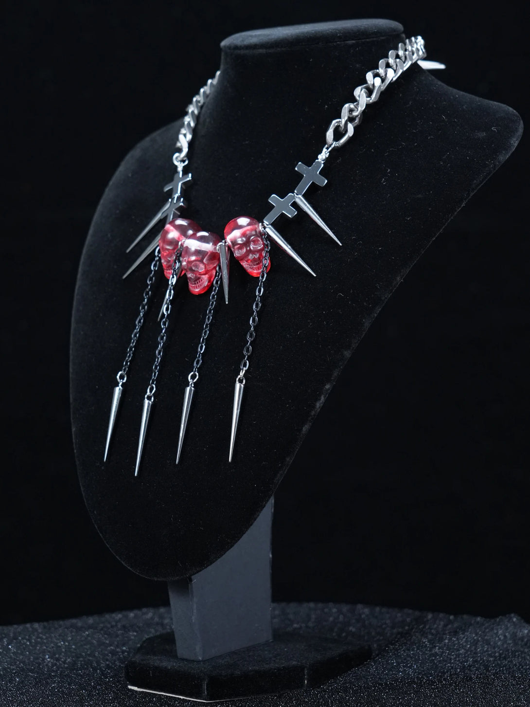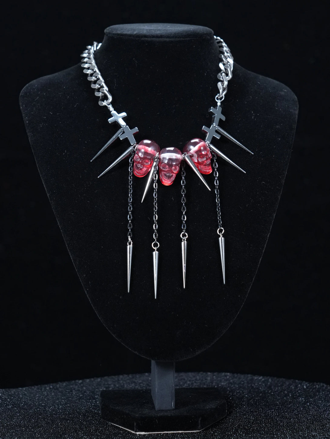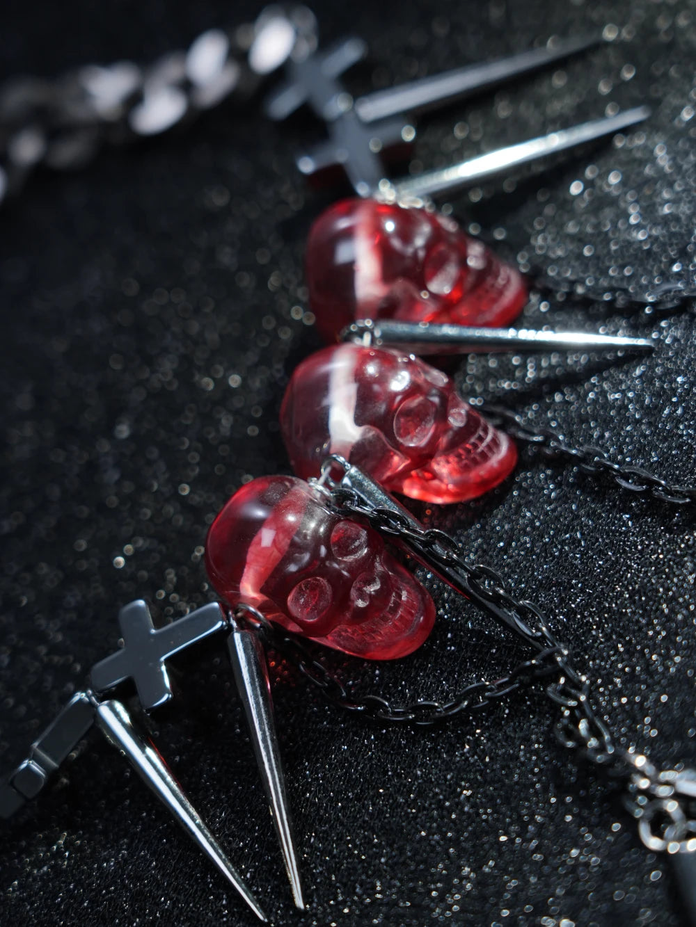 This edgy necklace features a sleek chain adorned with translucent red skull pendants and sharp silver-tone spikes. The blood-red skulls give off a haunting glow, while the metal spikes add a rebellious, punk-inspired twist. It’s the perfect finishing touch for any alternative outfit, rave look, or streetwear style.