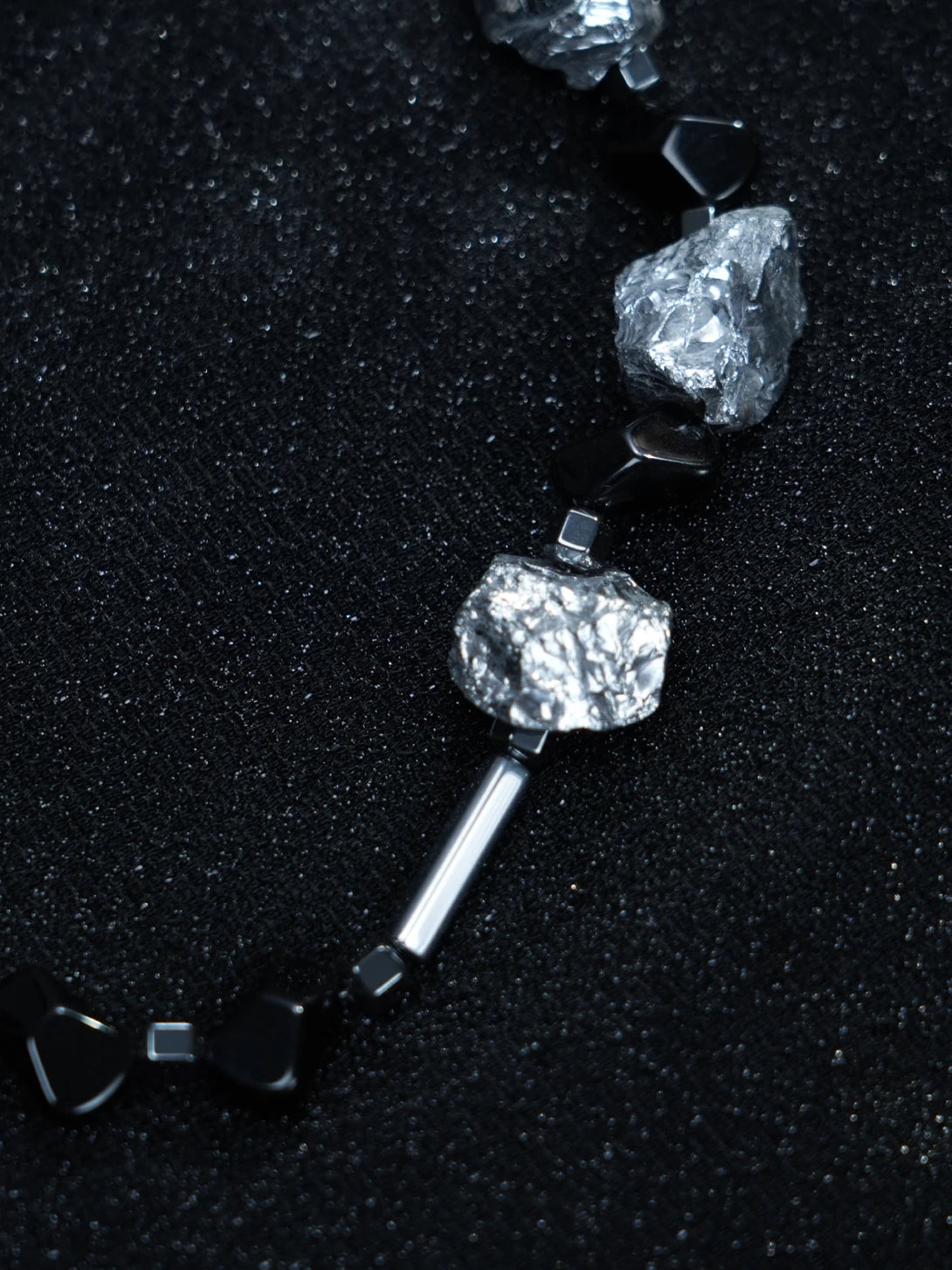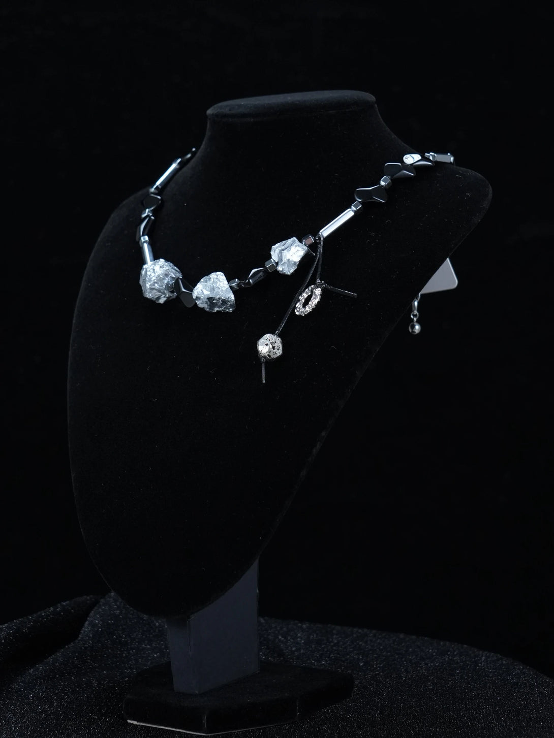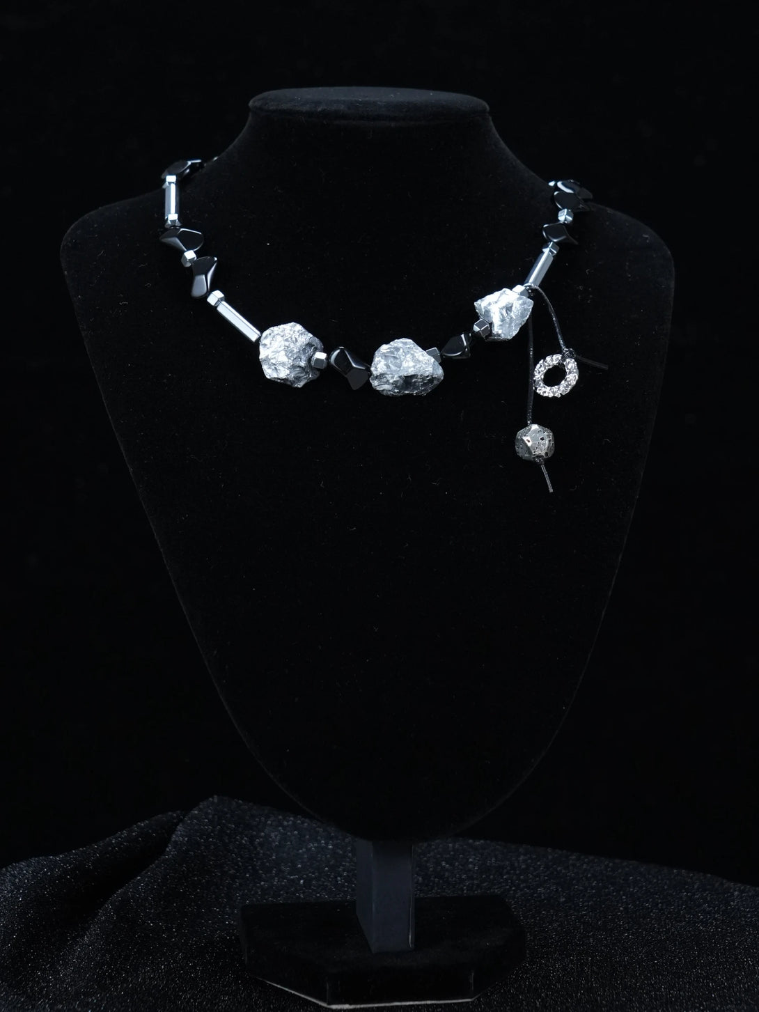 This Y2K-inspired necklace features a bold collision of textures and tones. Matte black beads meet crushed silver-like stones and irregular gray minerals, linked together by heavy-duty metal chains for a raw, industrial vibe. Small dangling charms add a rebellious twist, giving this piece an effortlessly dark and distinctive edge.