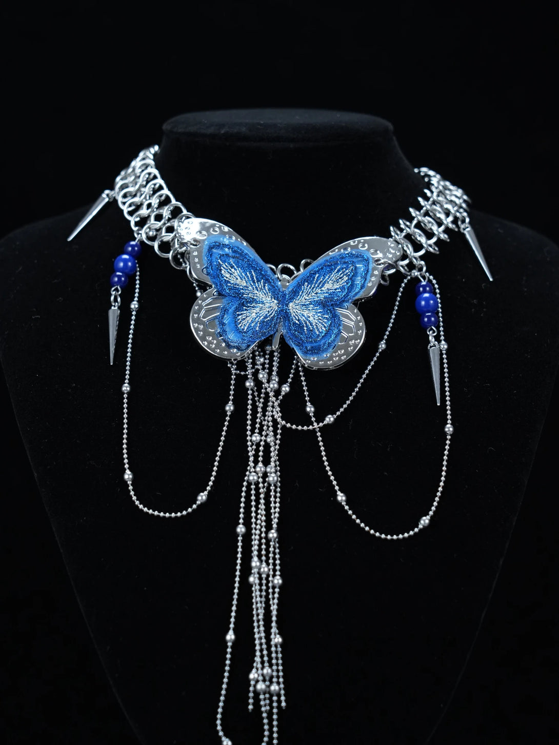 This Y2K gothic necklace features a striking silver-tone chain adorned with a vivid blue butterfly centerpiece—a symbol of transformation with a dark twist. Cascading chains and delicate dangling beads fall from the pendant, adding layered depth and rebellious grace to your look.