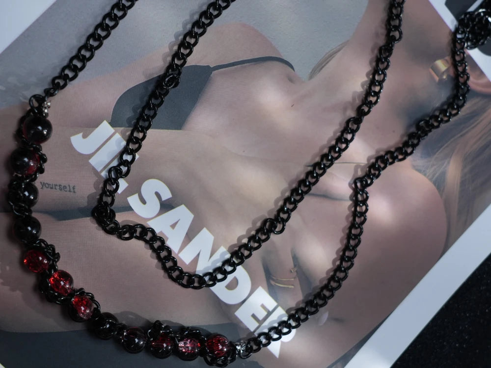 This double-layered necklace features a sleek black metal chain on top and a lower strand of textured, translucent beads in a rich reddish-purple hue. The subtle sheen and layered structure give it an effortlessly edgy vibe, perfect for mixing with chokers, charms, or wearing solo for a touch of gothic elegance.