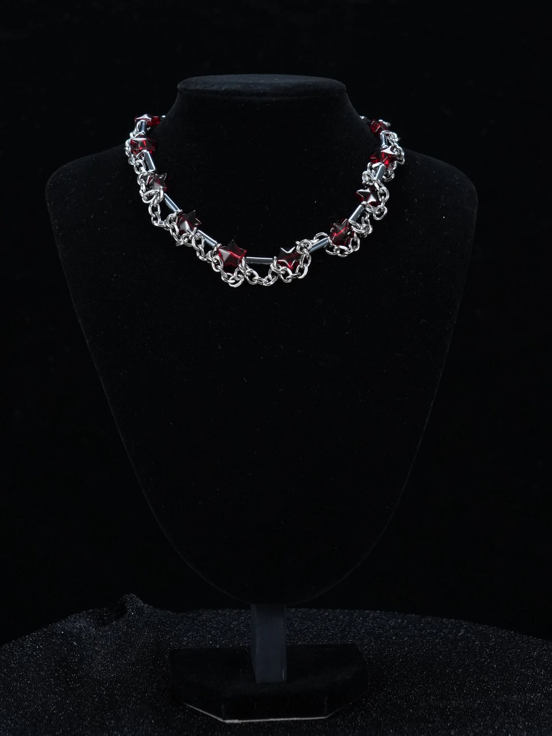 Crafted with a bold silver-tone chain and fiery red crystal-like stones, this piece adds a dark romantic vibe to any outfit. Whether you're channeling your inner punk princess or dressing up for a midnight rave, this necklace delivers sleek danger with a touch of glam.